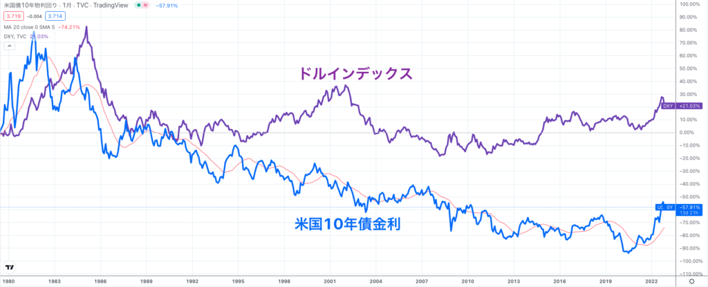 金利とドルは基本的に同じ動き、すなわち順相関になります。