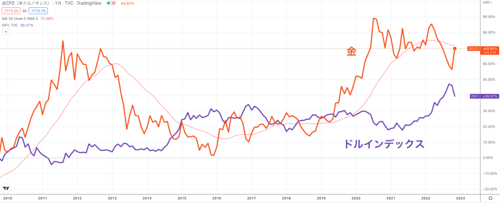 金とドルは基本的に逆の動き、すなわち逆相関となっております。
