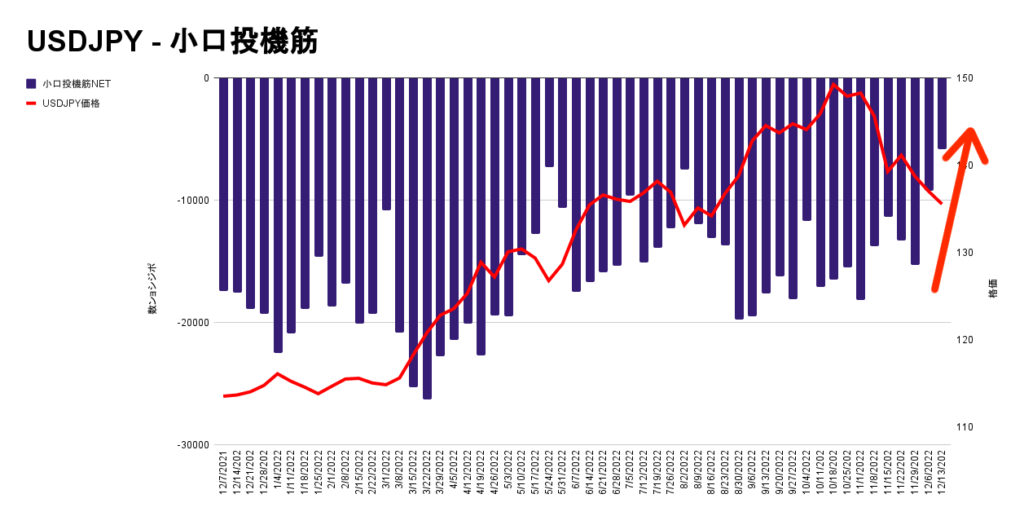 こちらはドル円に対する円の投機筋チャートですが、小口投機筋が円の売りポジション量を解消してきています。