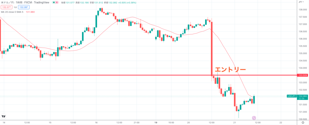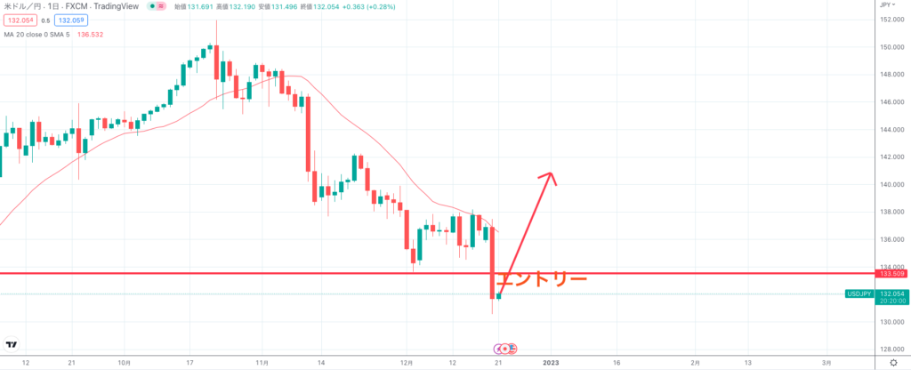 これを根拠にドル円は上昇すると考え、逆張りでロングを仕掛けました。