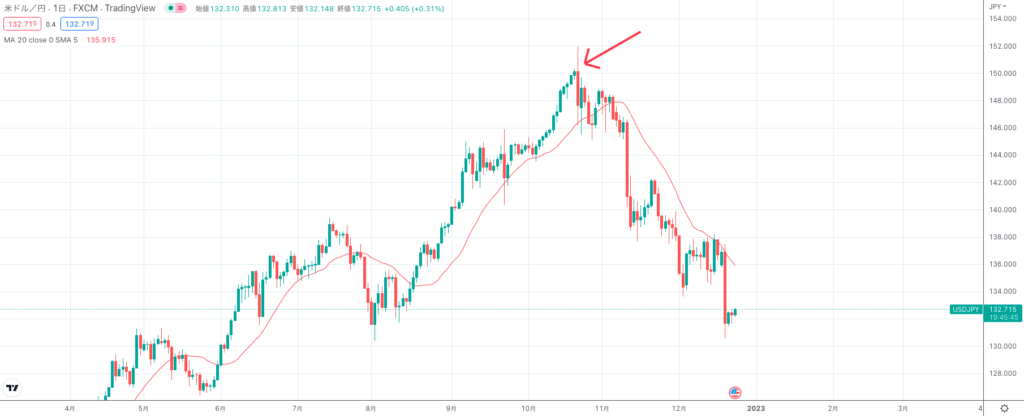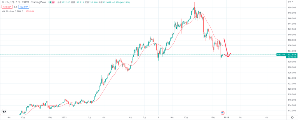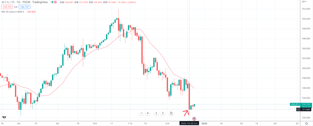 今回のドル円の下落でも注目すべきなのは12月20日(火曜日)の大陰線です。