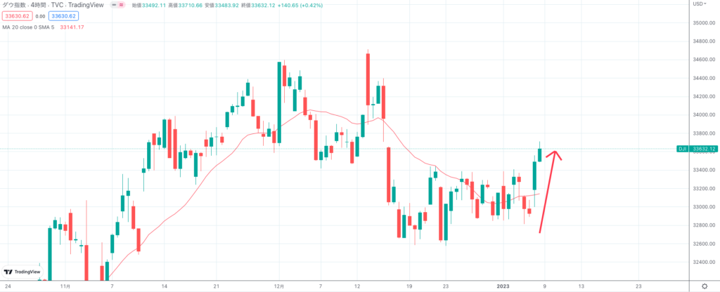 この雇用統計の結果を受けてFRBの金融引締の長期化懸念が和らぎ、NYダウを中心に上昇となりました。