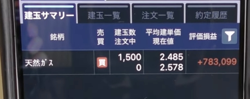 リナさん、こんにちは。天然ガスを6,000万円で買いエントリーをしており、現在約78万円の含み益が出ています。
