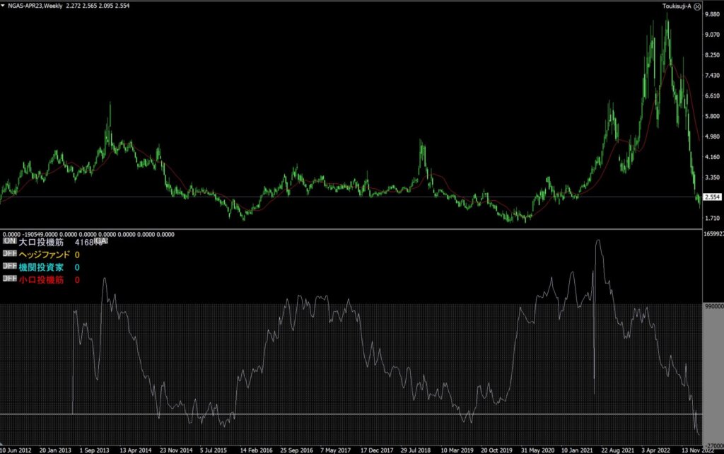 またMT4版投機筋チャートでは10年分を閲覧できますが、直近10年でも天然ガスの投機筋チャートは過去最安値となっています。