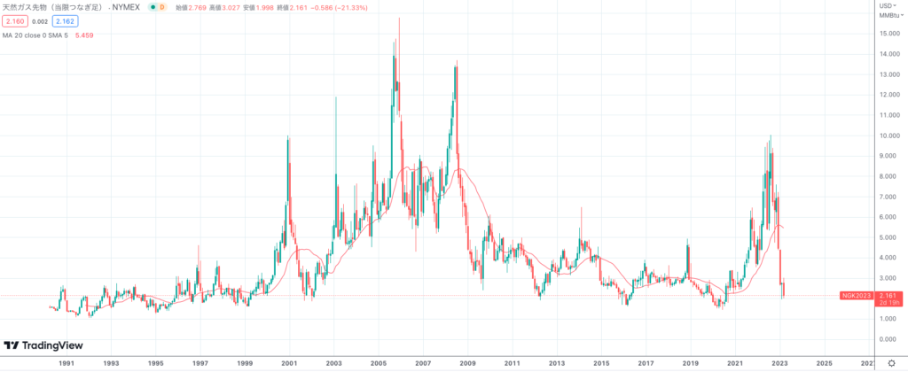 まず天然ガスは現在でも下落傾向にあり、過去30年のチャートでも過去最安値圏内にいます。
