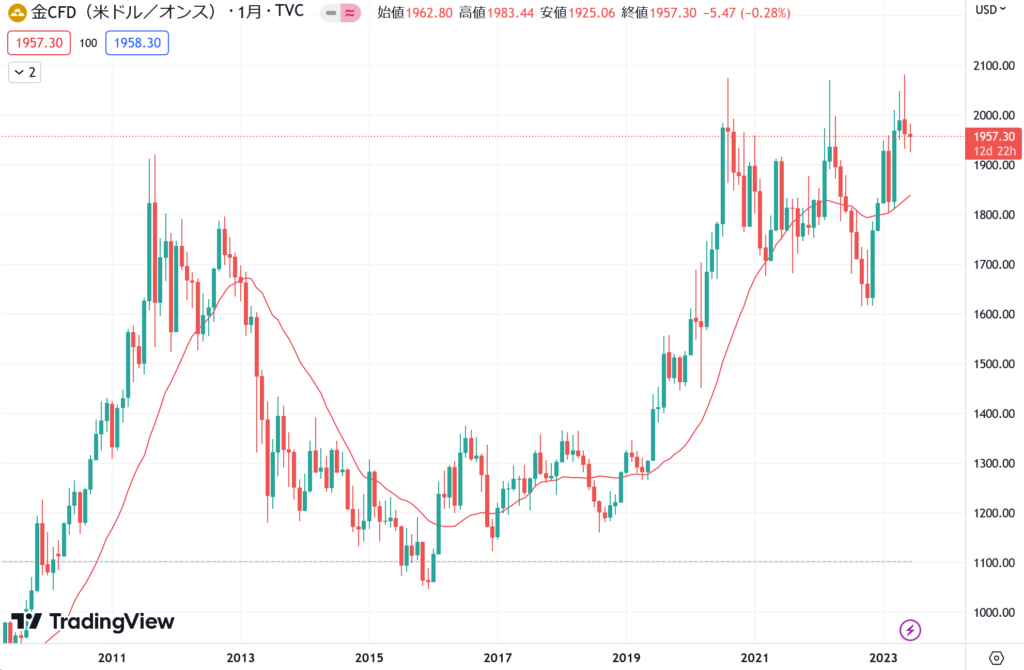 いつも見ている金チャートではこの数年間はずっと乱高下していて、すでに最高値から下がっています。