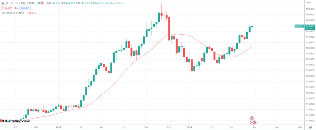 27日の米ニューヨーク外国為替市場で円安ドル高が進み、一時、昨年11月以来、約7カ月半ぶりに1ドル=144円台まで下落した。