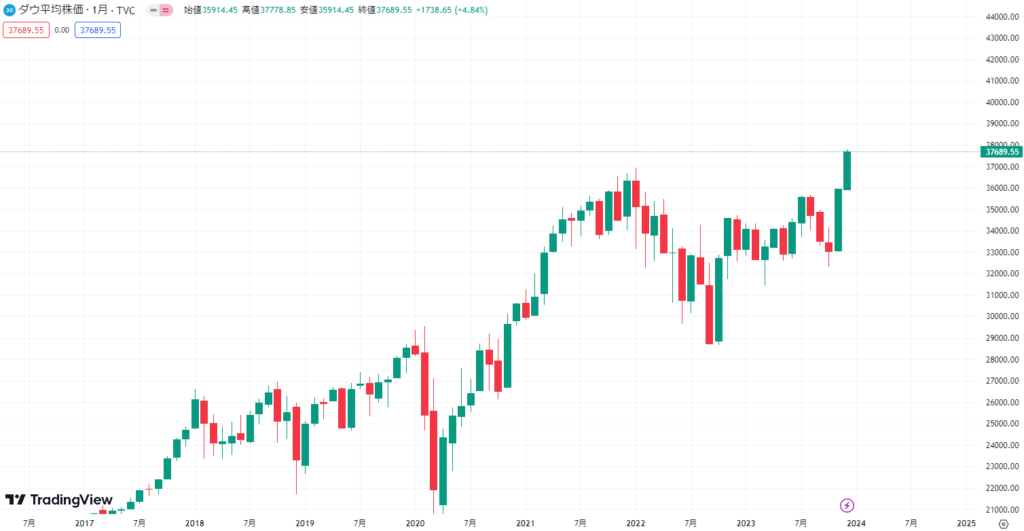 - 2023年のニューヨーク株式市場でのダウ平均株価は過去最高値に上昇し、上昇率は14%に達した。