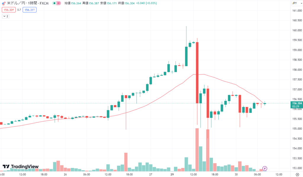 【為替介入か】円安一時160円台突破も、一気にドル円155円台まで円高 pic.twitter.com/nsArjlzGTy