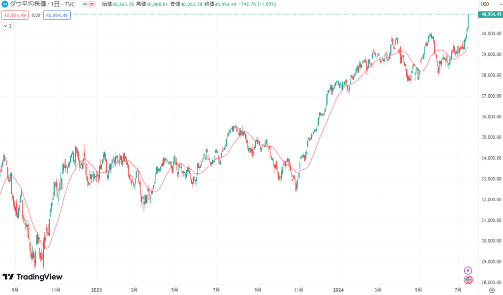 カナエさん、こんにちは。7月16日のニューヨーク株式市場でダウ平均株価が前日比742.76ドル高の4万954.48ドルになり、過去最高値を2日連続で更新しました。