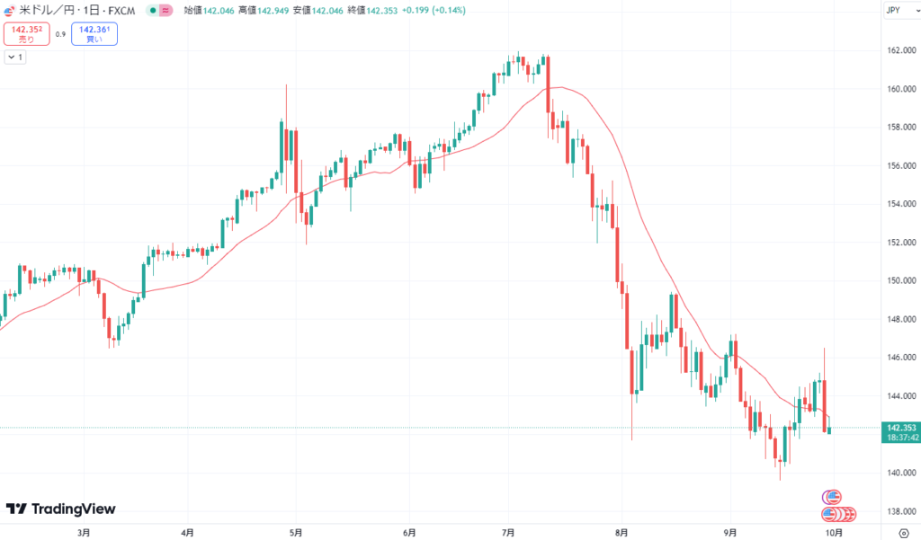 金融政策の正常化が遠のくと見られていたからですが、決戦投票で石破氏が逆転勝利した後に円が買い戻されて急に142円台まで上昇しました。
