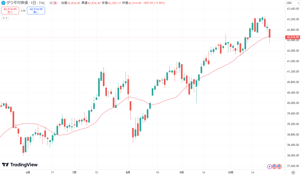 ニューヨーク株式市場で10月23日にダウ平均株価が一時は600ドル超も下がり、最終的には前日比で約409.94ドル安の42,514.95ドルで終わりました。