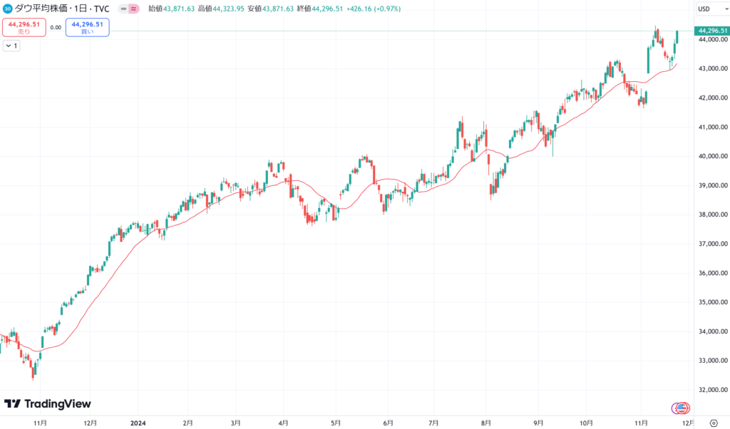 リナさん、こんにちは。ダウ平均株価は前日比426.16ドル高の4万4,296.51ドルで取引を終えました。