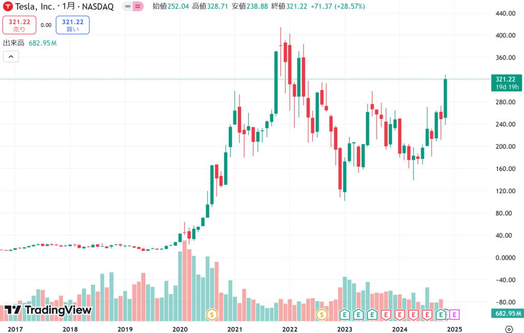 リナさん、こんにちは。テスラの株価は一時6%上昇して315.56ドルを記録しました。