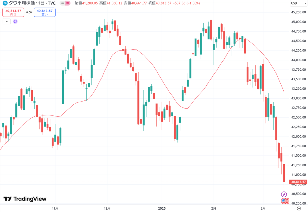 ダウ工業株30種平均は前日比537.36ドル安の4万813.57ドルで取引を終え、4日間の下げ幅は2,000ドルに迫ったようです。