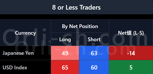 - 日本円:商業および上位8社のショートを根拠に短期円安の可能性