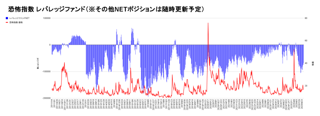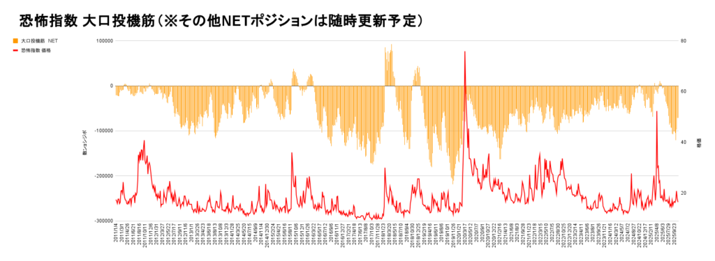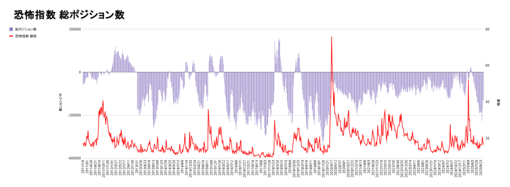 恐怖指数の売りポジション量が解消するということは、恐怖指数は買われ上昇することが考えられます。