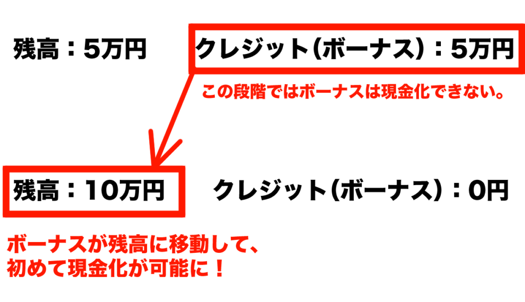 残高は実在するお金で、クレジット(ボーナス)は幻のお金というイメージです。